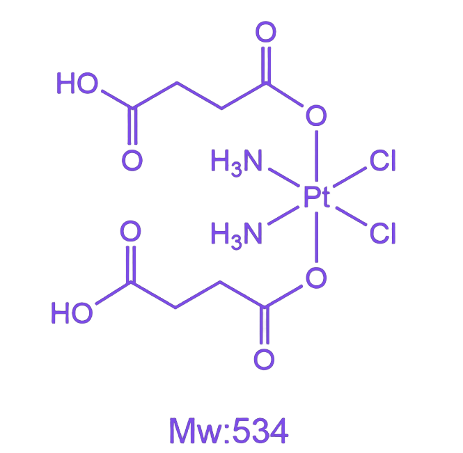 DDP-COOH(顺铂-羧基)是通过在经典抗肿瘤药物顺铂(化学结构为 cis-[Pt(NH₃)₂Cl₂])分子中引入 羧基(-COOH)官能团而得到的衍生物。其分子结构特征为在顺铂母体的特定位点共价连接一个或多个羧基,典型结构如 COOH-CDDP-COOH,这种修饰赋予了分子新的化学特性与潜在应用价值。 该羧基化衍生物的制备主要依赖化学合成手段,核心流程包括顺铂分子的活化处理、与羧酸或羧酸酯类化合物的定向反应,以及通过层析、重结晶等方法进行产物纯化,最终获得高纯度的目标化合物。羧基的引入不仅保留了顺铂的金属中心结构,还为其提供了可进一步修饰的反应位点,在药物递送系统构建、靶向治疗研究等领域具有重要的应用潜力。