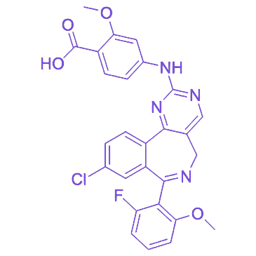 Alisertib是一种口服可用的选择性极光激酶A抑制剂,具有潜在的抗肿瘤活性。其作用机制为通过与极光激酶A结合并抑制其活性,干扰有丝分裂纺锤体装置组装,导致染色体分离异常,进而抑制细胞增殖。在细胞实验中表现出对极光激酶A的高选择性和强活性,无细胞试验中IC50值达1.2 nM,对极光激酶B的选择性高于200倍。 化学名称为2-(6-氯-9H-嘌呤-9-基)-N-(2,6-二甲基苯基)乙酰胺,分子结构包含嘌呤环、氯原子及乙酰胺基团。嘌呤环为其生物活性提供基础结构,氯原子和乙酰胺基团则影响化学稳定性与反应活性。 在常温、干燥、避光条件下具有一定稳定性,但对光、热、湿度敏感。光照可引发光化学反应导致结构变化和活性降低,高温可能促使分解反应,湿度较大时易发生水解。因此储存和运输需采取密封、冷藏、避光等措施以保证药物质量与稳定性。 分子中的氯原子具有反应活性,可在特定化学条件下参与取代反应,实现分子结构的修饰与改造。乙酰胺基团也可发生水解等化学反应,此类反应在药物代谢与转化过程中具有重要意义。