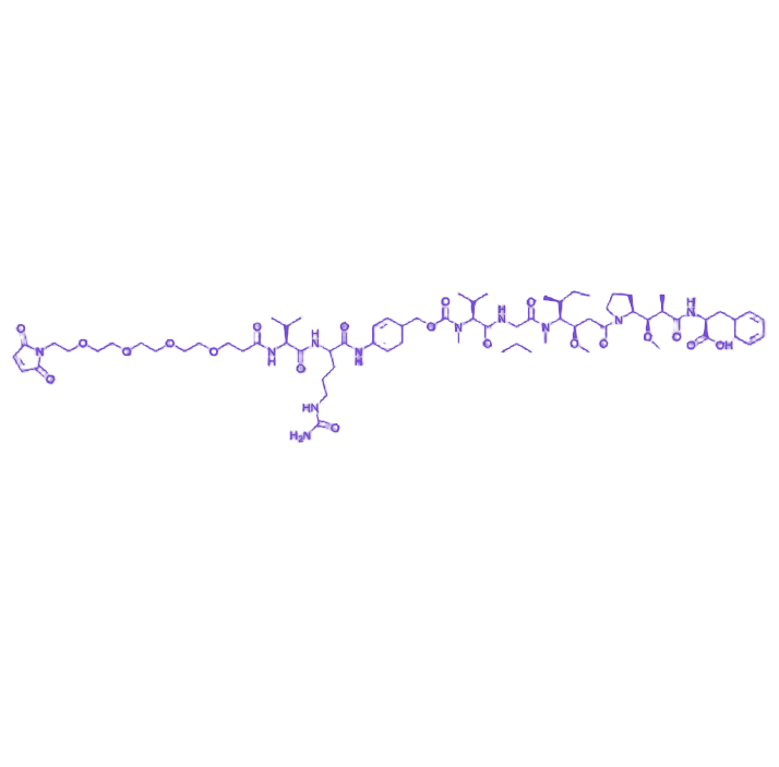 结构组成包含马来酰亚胺(Mal)基团、四聚乙二醇(PEG4)链、Val-Cit二肽序列、对氨基苄基(PAB)间隔臂及微管抑制剂MMAF。Mal基团可与抗体巯基特异性结合,实现抗体与药物的偶联;PEG4链能增强分子的水溶性和体内稳定性,提升ADC的药代动力学特性;Val-Cit二肽作为可裂解连接子,在肿瘤细胞溶酶体中被组织蛋白酶B特异性切割,随后触发PAB间隔臂的自消除反应,实现MMAF的精准释放。
