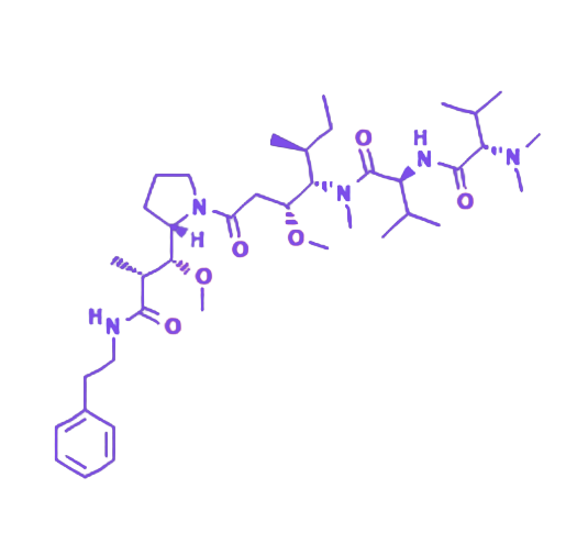 Auristatin PE是一种固体粉末状化合物,具备特定的理化特性与储存要求。其物理形态便于储存与运输,溶解性表现出显著的溶剂依赖性,稳定性受状态及储存条件影响较大,且作为非危险化学品可常温运输。 呈固体粉末状,该物理形态为储存与运输提供了便利性。在溶解性方面,展现出明显的溶剂选择性:在二甲基亚砜(DMSO)中溶解度良好,可达100mg/ml(142.45mM,需超声辅助),为实验或应用中的溶液制备提供了可行途径;而在水中溶解度极低,小于0.1mg/ml,几乎不溶,这极大限制了其在水相体系中的直接应用。 稳定性方面,固体粉末状态下相对稳定,储存条件对保质期影响显著:在干燥、避光且-20°C环境中可保存1年,置于4°C环境时保质期缩短至2年。需特别注意的是,该化合物在溶液中不稳定,实验操作时建议现用现配。储存运输上,作为非危险化学品常以常温运输,但具体需参考分析证书,确保在适宜条件下转移以维持其物理性质稳定,保障后续使用效能。