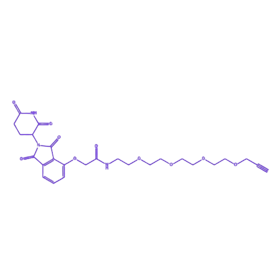 CRBN 配体作为核心功能单元,能够高效招募 E3 泛素连接酶,为蛋白降解信号的启动提供分子基础;末端炔基则通过 铜催化的叠氮-炔环加成反应(CuAAC)与含叠氮基团的靶蛋白配体特异性偶联,构建完整的三元复合物,从而触发泛素-蛋白酶体途径对目标蛋白的降解。PEG4 连接子在结构中发挥关键调节作用,其柔性链段可提供适宜的空间臂长,有效减少分子间位阻冲突,同时增强复合物的水溶性与结构稳定性,提升生物利用度。