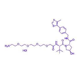核心功能单元 AHPC 作为 VHL E3 泛素连接酶的高特异性配体,通过精准分子间相互作用与 VHL 蛋白稳定结合,为靶蛋白的泛素化降解过程提供关键酶学支撑。连接臂采用 PEG4 链(四乙二醇单元),长度约 8-12Å,该设计兼具良好柔性与强亲水性,可适配靶蛋白与 VHL 结合位点间距 7-13Å 的空间需求,既能有效缓冲靶点构象波动,又能避免长链 PEG 可能导致的无序折叠问题。末端氨基经 盐酸盐修饰后形成质子化结构(-NH3+Cl-),显著改善游离胺的水溶性并抑制氧化风险,同时可通过 pH 调节实现反应活性的精准控制,确保与含活性酯的靶蛋白配体高效发生酰胺化反应。