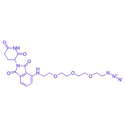 Pomalidomide 4'-PEG3-azide是基于泊马度胺(Pomalidomide)结构开发的功能化衍生物,其分子设计在4'位引入三单元聚乙二醇(PEG3)柔性链段并末端修饰叠氮基(-N₃),整合了小分子药物骨架、亲水链段及高活性点击化学官能团,为生物分子偶联与功能化研究提供理想平台。 PEG3链段在分子中发挥多重关键作用,通过增强水溶性和分子柔性,有效降低疏水聚集,同时为偶联反应提供必要的空间距离,避免连接位点对泊马度胺核心结构产生空间干扰,确保偶联后靶分子的生物活性与结构稳定性得以保持。C3及PEG3的柔性延长链段赋予分子良好的空间自由度,显著降低与蛋白质、多肽或纳米材料偶联过程中的空间位阻,提高偶联产物的产率及功能完整性。 末端叠氮基(-N₃)作为典型的点击化学官能团,可通过铜催化叠氮-炔烃环加成(CuAAC)或无铜应力促进环加成反应(SPAAC)与炔基分子高效偶联,生成稳定的三唑键。该特性使其在分子探针构建、功能化纳米材料制备及药物递送体系开发中展现出独特优势,凭借结构模块化设计、反应特异性高及生物相容性良好等特点,在化学生物学、分子成像、纳米材料功能化及药物递送等研究领域具有广阔的应用前景。