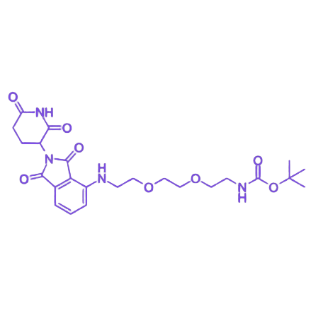 该分子以沙利度胺为核心骨架,通过化学修饰引入PEG2(双单元聚乙二醇)链段,可显著提升水溶性并优化分子柔性,有效降低偶联过程中的空间位阻效应,为与多肽、抗体或纳米载体的连接提供适宜分子间距。C2(两个碳原子)间隔基团进一步延长分子骨架,确保与靶分子结合时的空间构象自由度,维持偶联后生物分子的天然活性。末端Boc(叔丁氧羰基)保护基的引入,可在合成及储存阶段保障分子稳定性,避免氨基非预期副反应;在实验需要时,Boc基团可通过温和条件脱除,释放游离氨基以进行后续偶联反应,实现高效可控的化学修饰。