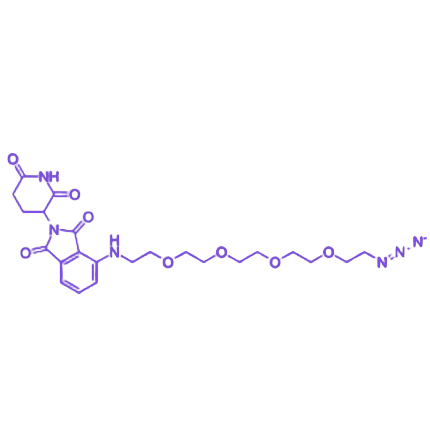 Pomalidomide-PEG4-azide 是一种整合了小分子药物核心、亲水柔性链及高反应活性点击化学官能团的泊马度胺衍生功能分子,其在分子4'位引入四单元聚乙二醇(PEG4)链段并末端修饰叠氮基(-N₃),为生物正交化学、分子探针构建及功能化材料开发提供了可靠的模块化工具。 该分子通过在 泊马度胺母核4'位 引入 四单元聚乙二醇(PEG4)链段,赋予结构良好的亲水性与柔性,有效减少分子间非特异性吸附和疏水聚集,同时为偶联反应提供充足空间距离,避免连接位点对母核结构的直接干扰,保障偶联产物的空间稳定性和功能完整性。PEG4链段的引入进一步提升了偶联过程中的可及性和空间自由度,在与蛋白质、多肽或纳米材料偶联时能显著降低空间位阻,确保偶联产物的产率和功能稳定性。 末端修饰的 叠氮基(-N₃) 作为点击化学关键官能团,可在温和条件下与炔基分子高效反应生成稳定的三唑键,适用于纳米探针、分子成像试剂及药物递送体系的功能化修饰。凭借高度特异性的反应特性、良好的生物相容性及模块化设计优势,该分子在化学生物学研究、分子成像技术开发、纳米材料功能化及药物递送系统构建等领域展现出广泛应用前景。
