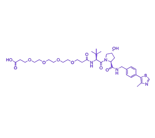 (S,R,S)-AHPC-PEG4-acid 是 PROTAC(蛋白降解剂)研究中用于构建 E3 连接酶招募端与 链接子的功能性模块,由 (S,R,S)-AHPC 配体、PEG4 间隔基及羧酸末端组成,旨在通过模块化设计支持 PROTAC 分子的高效构建与活性优化。其核心功能是作为 VHL E3 连接蛋白的特异性配体,通过羧酸基团与目标蛋白配体或其他功能模块进行化学偶联,同时借助 PEG4 间隔基调节分子柔性与亲水性,以满足三元复合物形成及细胞摄取等生物学过程的需求。 该化合物的化学结构包含三个关键组成部分:(S,R,S)-AHPC 配体作为 E3 连接酶结合单元,通过特异性相互作用靶向 VHL E3 连接蛋白;PEG4 spacer(四个乙二醇重复单元)作为连接臂,提供适度的 亲水性与 构象柔性,减少分子内聚集并促进三元复合物(E3–PROTAC–Target 蛋白)的空间匹配;末端羧酸基团(-COOH)为反应性官能团,可通过 酰胺键或其他化学方式与目标蛋白配体或扩展模块偶联,偶联前需确保化学纯度与反应位点无阻碍。 化学参数方面,根据公开数据,该化合物的化学式为 C₃₄H₅₀N₄O₁₀S,分子量约 706.9 Da,属于“小‐中分子”范畴,在保证分子体积适中的同时,避免因过度庞大影响细胞膜渗透性与细胞摄取效率。理化特性上,PEG4 间隔基的引入可提升分子在水性或混合溶剂体系中的 溶解/分散性能,而羧酸末端在干燥低温条件下稳定性较好,在水相或碱性环境中可能发生非特异性反应或降解,需注意储存条件与反应体系控制。 应用场景聚焦于 PROTAC 分子的设计与筛选,尤其适用于构建 PROTAC library 以系统评估链接子长度对降解活性的影响。其模块化结构允许研究者灵活替换目标蛋白配体,通过调节三元复合物的空间构象与结合能,优化 PROTAC 分子的降解效率与选择性。使用过程中需确保羧酸末端的反应活性,通过适当的活化试剂(如 HATU、EDC 等)实现高效偶联,同时结合分子对接与细胞实验验证间隔基长度对生物学活性的调控作用。