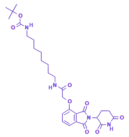 Thalidomide-O-amido-C8-NHBoc 是一种基于来那度胺骨架设计的功能化衍生物,通过 O-amido 连接桥与 C8 直链烷基及 NHBoc 保护氨基进行分子组装,在保留母体化合物核心药效特性的同时,显著增强了分子的可修饰性与化学稳定性。其结构设计赋予分子良好的亲脂性与水溶液分散性,适用于多步骤合成及多功能化分子构建场景。