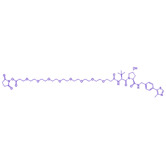 (S,R,S)-AHPC-PEG8-NHS是PROTAC技术领域针对长链连接臂需求设计的核心构建模块,其分子结构整合靶向识别、柔性连接与共价组装三大功能,适用于构建靶向大型蛋白复合体的PROTAC分子及探究长链连接臂对降解活性的影响。 核心组件AHPC作为VHL E3泛素连接酶的特异性配体,通过精准分子间作用与VHL蛋白稳定结合,为靶蛋白泛素化提供关键酶学基础。PEG8连接臂由8个乙二醇单元构成,具备超长柔性与高亲水性,可显著改善化合物水溶性与生物相容性,同时为PROTAC分子提供更大空间调节范围,适配靶蛋白与VHL连接酶结合位点间距较大的靶点,有效降低三元复合物形成的空间位阻。NHS酯基团作为高活性反应位点,能与靶蛋白配体的伯氨基高效反应,实现功能模块的共价组装。 该产品特别适用于解决短链连接臂无法覆盖的空间适配问题,为PROTAC文库筛选提供关键工具,在开发针对性靶向降解剂方面具有重要应用价值。
