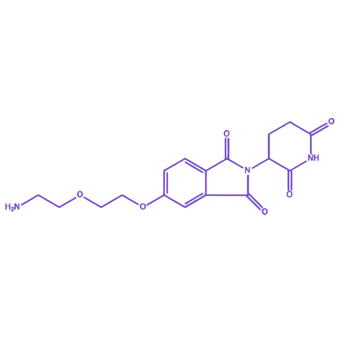 Thalidomide-5-PEG2-NH2 是一种以沙利度胺为核心结构,通过短链聚乙二醇(PEG2)连接氨基(-NH2)功能基团的分子衍生物,其设计兼顾母核药效活性与修饰灵活性,适用于生物材料功能化、靶向药物递送及生物探针开发等领域。 该分子保留沙利度胺的核心骨架以维持其药效学特性,同时引入 PEG2 柔性亲水链段,可显著提升分子水溶性、空间柔性与生物相容性,减少疏水性骨架引发的非特异性结合,并增强整体结构稳定性。末端 氨基官能团 提供高效化学反应位点,能与NHS酯、异硫氰酸酯等试剂发生特异性偶联,支持纳米药物载体、抗体-药物偶联物(ADC)及表面功能化材料的精准构建。 产品可与荧光染料、亲和配体或药效分子结合实现多功能化设计,满足多样化科研需求。建议以高纯度粉末或溶液形式避光保存,避免潮湿与高温环境;使用前需在无水溶剂中溶解,并根据实验需求优化反应体系及偶联条件,以保障活性基团的反应效率。