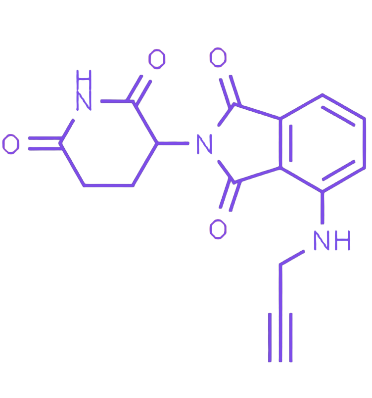 Pomalidomide-propargyl 是泊马度胺的小分子衍生物,通过在分子特定位置引入丙炔基(-C≡CH)官能团,整合了药物母核的生物活性与可点击化学偶联的特性,为化学生物学研究及功能化分子构建提供了高效工具。该分子保留泊马度胺母核核心结构,确保在生物体系中的稳定性与活性,同时丙炔基的引入赋予其可控的化学连接能力,可灵活构建荧光标记分子、靶向纳米载体及药物递送系统等功能化体系。 丙炔基作为关键功能团,具有高反应活性,可在温和条件下与叠氮基(-N₃)发生 铜催化叠氮-炔烃环加成(CuAAC)反应,形成稳定三唑环。这一特性使 Pomalidomide-propargyl 能便捷地与炔基或叠氮基修饰的分子、蛋白质、荧光探针及纳米载体进行偶联,在保持母核药物活性的同时实现精准分子功能化。 凭借小分子核心的结构稳定性、丙炔基的高反应性及良好的化学可修饰性,Pomalidomide-propargyl 在 分子探针构建、功能化纳米材料开发及 药物递送系统研究中展现出广阔应用前景,为科研人员提供了可靠的化学工具,助力化学生物学领域的机制研究与创新应用。