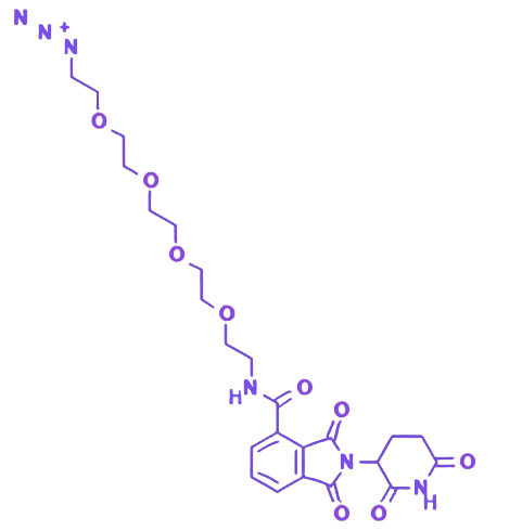 其化学结构设计核心在于来那度胺母核的5位修饰:引入的四聚乙二醇(PEG4)链段显著提升分子亲水性与柔性,有效降低空间位阻,确保叠氮端基在水相或生理条件下能通过点击化学(Click Chemistry)高效偶联炔基功能分子。相较于短链PEG修饰,PEG4的分子伸展性更优,有助于构建空间结构合理的多功能复合体。