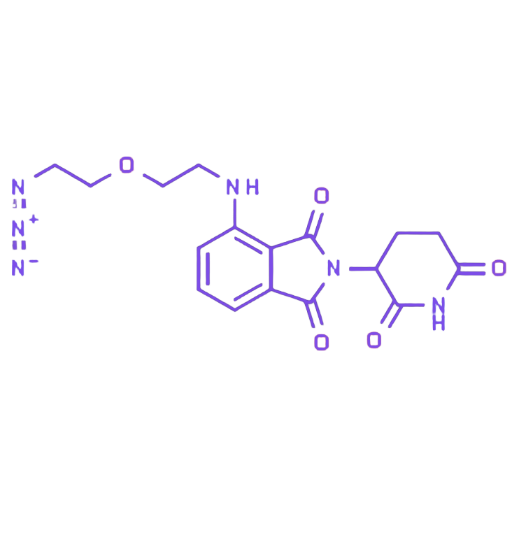 Pomalidomide-PEG1-C2-N3 是一种以 泊马度胺(Pomalidomide) 为核心骨架的功能性小分子衍生物,通过引入 聚乙二醇单元(PEG1)、C2 间隔基团和末端 叠氮基(-N3),构建了兼具药物活性、亲水性修饰及高效偶联能力的多功能分子平台。其设计理念聚焦于优化分子理化性质与生物偶联兼容性,为生物正交化学、探针开发及纳米材料功能化提供了结构基础。 PEG1 链段作为亲水柔性链,显著提升分子水溶性与构象柔性,同时通过空间位阻效应减少生物体系中的非特异性吸附,确保母核药物活性位点的暴露。C2 双碳链间隔基团进一步延长分子骨架,增强偶联过程中的空间适应性,有效缓解连接位点与母核的空间冲突,提升偶联产物的结构稳定性。末端叠氮基(-N3)作为 点击化学(Click Chemistry) 的特征反应基团,可在温和条件下通过铜催化叠氮-炔烃环加成(CuAAC)或无铜应力促进反应,与含炔基分子高效偶联形成稳定三唑键,为多肽、蛋白质或纳米载体的定点修饰提供高效化学工具。