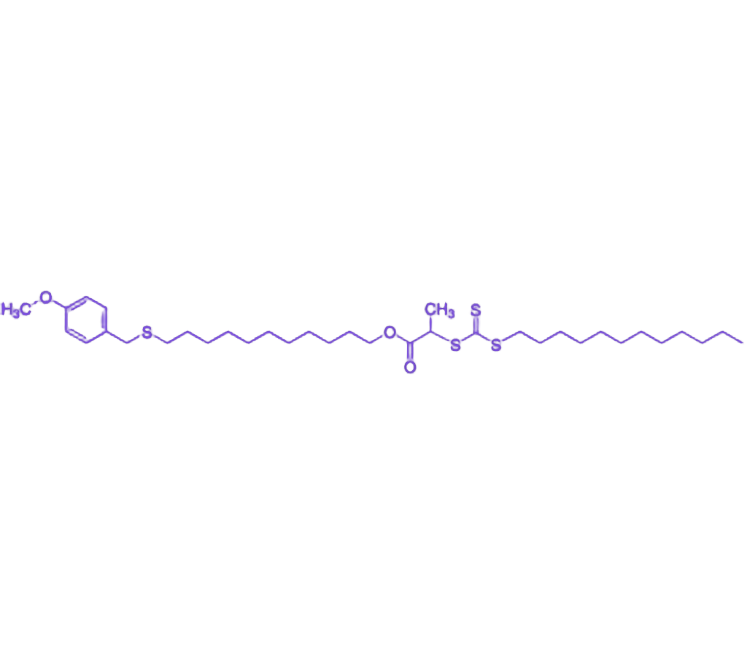 该试剂的分子结构以2-(((十二烷基硫代)碳硫基)硫代)丙酸酯作为核心RAFT活性中心,确保对聚合过程的精准调控;分子一端通过长柔性十一烷基间隔链连接对甲氧基苄基硫醚基团,另一端则为常规十二烷基链。这种结构设计使其在传统RAFT试剂控制聚合功能基础上,额外具备了化学刺激响应性和空间位阻调控的双重能力。