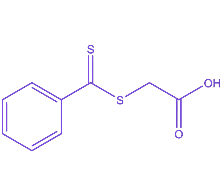 2-((苯基硫代羰基)硫代)乙酸是一种结构简洁、功能明确的羧酸封端二硫代氨基甲酸酯类RAFT链转移剂,其分子设计集成了高效聚合控制与便捷后功能化能力,在功能高分子合成领域具有重要应用价值。该试剂通过R基团(乙酸单元)、活性中心(二硫代氨基甲酸酯键)和Z基团(苯基)的协同作用实现核心功能:R基团断裂后形成低空间位阻碳中心自由基,活性中心负责可逆链转移过程,Z基团则通过共轭效应稳定反应中间体,末端羧酸基团赋予试剂优异的后修饰潜力。 在聚合性能方面,该试剂对苯乙烯、丙烯酸酯类等单体表现出良好控制能力,苯基Z基团的共轭效应可适度稳定增长链自由基,在保证聚合速率的同时实现较窄分子量分布。相较于长烷基链或氰基取代的RAFT试剂,其结构更简单、合成成本更低,且在多体系中保持可靠控制性,水溶性盐形式可进一步拓展至水相或水/有机混合相聚合。 分子结构中的末端羧基作为高反应活性“手柄”,可通过碳二亚胺等偶联剂与胺基高效反应形成酰胺键,实现荧光染料、靶向配体、蛋白质或药物分子的共价连接,为生物医学领域的靶向给药、生物成像等应用奠定基础。此外,苯基结构可通过π-π堆积相互作用促进聚合物自组装或与富电子材料的界面结合,在光电领域可能赋予材料特定光学或电子性能。 该试剂凭借有效的聚合控制性、高反应性末端羧基及简单苯基结构,成为合成功能化聚合物的实用经济选择,尤其适用于生物偶联和智能材料构建,其设计理念满足了功能高分子合成中对可控聚合与精准功能化的双重需求。