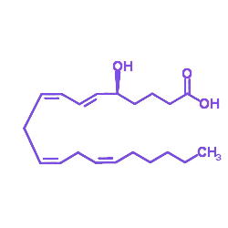 5-HETE 是花生四烯酸经 5-脂氧合酶 代谢途径生成的重要生物活性脂质介质,作为白三烯等生物活性物质的前体参与体内多种生理过程,并具有显著的化学反应性,在有机合成与生物化学研究中具有重要应用价值。 5-HETE 可通过特异性作用吸引并激活 嗜酸性粒细胞、中性粒细胞 等免疫细胞,同时参与细胞信号传导过程,对细胞增殖、分化等生理活动发挥调控作用,其生物学功能为炎症反应及免疫调节机制研究提供了关键分子靶点。 该分子结构中的 羟基 可发生酯化、醚化等化学反应,例如与羧酸类化合物在催化条件下生成酯类衍生物,或与醇类物质反应形成醚键结构;分子中的 双键 则可进行卤素加成、卤化氢加成等反应,也可被臭氧、高锰酸钾等氧化剂氧化导致双键断裂,生成具有特定官能团的氧化产物,这些化学特性为其结构修饰及功能探针设计奠定了化学基础。