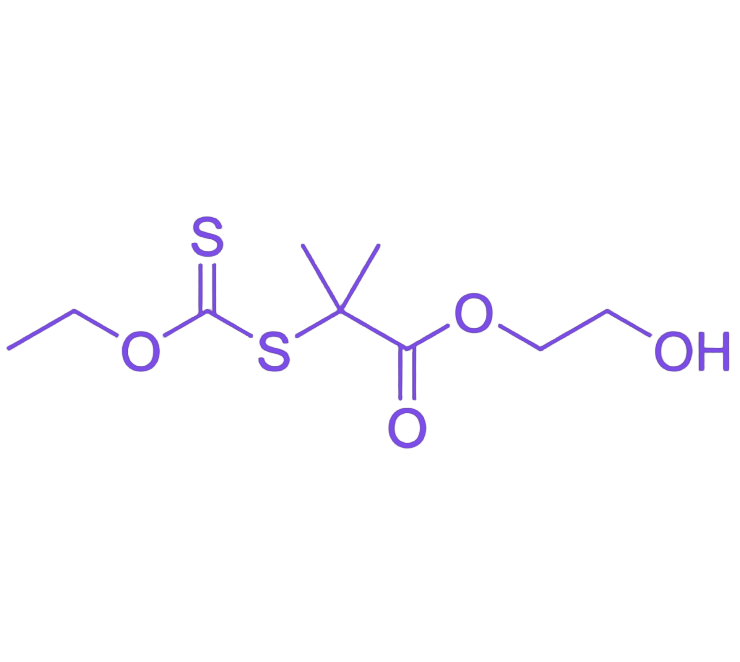 2-((乙氧基硫代羰基)硫代)-2-甲基丙酸 2-羟乙酯(HEEMT)是一种整合RAFT聚合活性与羟基反应性的多功能链转移剂,其分子结构包含三大关键功能模块。R基团为α-甲基丙酸羟乙酯单元,断裂后形成稳定的叔碳自由基,可实现对甲基丙烯酸酯类等单体的精准控制;Z基团为乙氧基,通过三硫代碳酸酯键连接并提供适中的链转移常数;末端的伯羟基作为标志性特征,为聚合物提供直接、高效且生物相容性良好的后修饰位点。
