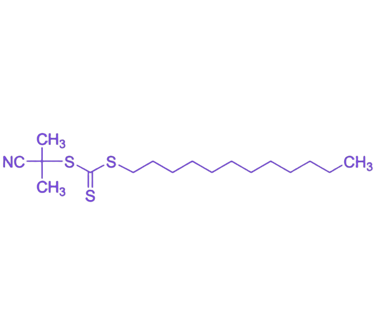 2-氰基-2-丙基十二烷基三硫代碳酸酯作为RAFT聚合技术中具有代表性的链转移剂,其分子结构融合了强吸电子基团、活性中心与长链烷基的协同设计,展现出优异的聚合调控性能与广泛的材料应用价值。 分子结构层面,该试剂一端为氰基异丙基基团,通过强吸电子效应稳定增长链自由基,保障聚合过程的“活性”特征;中间以三硫代碳酸酯作为可逆链转移的核心活性中心;另一端引入十二烷基长链,不仅提升有机相容性与疏水性,还通过空间位阻效应优化链转移效率。这种平衡设计赋予试剂适中的链转移常数与化学通用性,成为RAFT试剂分子设计的典范结构。 聚合性能方面,该试剂对苯乙烯、甲基丙烯酸甲酯等常规单体及丙烯酸、丙烯酰胺等功能单体均表现出优异的分子量控制能力,可合成窄分布聚合物。其“活性”特征支持通过顺序加料法精准制备嵌段共聚物(如聚苯乙烯-聚甲基丙烯酸甲酯两亲性材料),并为星形、接枝等复杂拓扑结构聚合物的构建提供关键技术支撑。 材料应用领域,基于该试剂合成的聚合物已广泛用于前沿研究:生物医学领域可构建智能药物递送系统的核壳结构纳米粒子;光电领域用于制备有机太阳能电池活性层及发光二极管电荷传输层;工业领域则用于开发高性能涂料、粘合剂与功能添加剂。十二烷基长链的引入进一步增强了试剂在有机相中的溶解性,同时提升了疏水嵌段自组装过程中的形态稳定性。作为RAFT聚合的“标准试剂”,其推动了可控/活性自由基聚合技术从实验室研究向工业化应用的转化,至今仍是高分子合成领域不可或缺的核心工具。