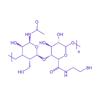 在化学活性方面,巯基官能团的引入是HA-SH的核心特性。该基团可与多种金属离子发生配位反应,并能在温和氧化条件下通过二硫键(-S-S-)形成实现分子间交联,为三维网络结构构建提供化学基础。同时,巯基还可与含互补反应位点的分子进行共价结合,拓展了材料的修饰与功能化途径。此外,HA-SH保留了透明质酸原有的羧基反应活性,可通过酯化、酰胺化等反应进一步衍生,使其在生物材料表面改性、药物控释载体设计等场景中展现出多元应用价值。