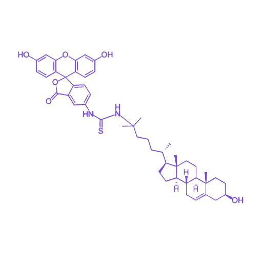 FITC-25-OH-cholesterol 是一种兼具生物活性与荧光示踪功能的 25-羟基胆固醇衍生物,通过化学方法将天然活性分子 25-羟基胆固醇与 FITC 荧光团稳定连接而成。该衍生物在保留 25-羟基胆固醇原有生物活性的基础上,赋予了 FITC 特有的荧光特性,为细胞水平的动态研究提供了可视化工具。 其核心特性体现在双重功能的协同:一方面,母体分子 25-羟基胆固醇的结构完整性确保了对生物系统的生理相关性;另一方面,FITC 荧光团的引入使其可通过 荧光成像、流式细胞术及 活细胞成像等技术手段,实现对目标分子在细胞内的分布定位、动态运输路径及相互作用靶点的实时追踪与定量分析。这种设计使其在脂质代谢调控、受体介导信号通路及亚细胞结构靶向研究中具有重要应用价值。