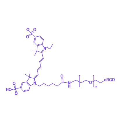 CY5-PEG-cRGD 是一种由 CY5 近红外荧光染料、聚乙二醇(PEG)和 cRGD 靶向环肽通过化学偶联形成的多功能靶向成像探针,其设计整合了荧光成像、生物相容性优化和肿瘤靶向识别等核心功能,可应用于生物医学领域的靶向成像研究。 CY5 作为近红外荧光染料,发射波长位于 650-700nm 近红外光谱区域,该特性赋予其在生物成像中较深的组织穿透能力,同时有效降低组织自发荧光干扰,从而显著提升成像的信噪比与检测准确性。 PEG 作为亲水性聚合物,在分子结构中发挥连接与稳定作用。通过引入 PEG 链段,可显著改善化合物的水溶性和体内稳定性,减少与非靶组织的非特异性相互作用,进而间接增强整体分子的靶向递送效率。 cRGD 是经环化修饰的 RGD 肽类似物,由精氨酸(Arg)、甘氨酸(Gly)和天冬氨酸(Asp)组成环状序列。其核心优势在于对 αvβ3 整合素受体的高度特异性结合能力,该受体在多种肿瘤细胞及新生血管内皮细胞表面高表达,而在正常细胞中低表达,因此 cRGD 可作为靶向引导单元,将整个分子精准递送至病变部位,实现对特定组织的选择性成像与研究。