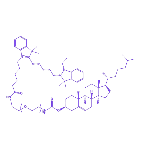 Cy5-PEG-CHOL是一种多功能生物分子探针,通过整合Cy5荧光基团、聚乙二醇(PEG)链段与胆固醇分子,实现了荧光标记、生物相容性优化及细胞膜靶向的协同功能,适用于生物检测、细胞成像及膜生物学研究等领域。 Cy5作为核心荧光单元,属于菁染料家族,具有较高的荧光量子产率,其特征激发波长约为649nm,发射波长约为666nm,发射醒目的红色荧光信号,为生物样本中的动态追踪和可视化观察提供了优异的光学性能。PEG链段作为柔性连接臂,不仅显著降低了分子的免疫原性并提升生物相容性,还能有效阻止分子间聚集,确保探针在生物环境中的分散稳定性。胆固醇部分凭借其天然的细胞膜插入能力,可驱动整个分子高效锚定至细胞膜表面,为膜相关生物过程(如膜蛋白动态、细胞间通讯等)的标记与长期监测奠定基础。 在化学修饰潜力方面,PEG链末端的羟基基团可通过酯化等化学反应与含羧基的分子偶联,实现探针的进一步功能化衍生;胆固醇部分虽相对稳定,但在特定酶(如胆固醇氧化酶)作用下可发生特异性反应,为拓展其生物学应用提供了更多可能性。