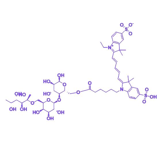 CY5-2-Fucosyl lactose 是通过化学偶联将 Cy5 荧光染料与 2-岩藻糖基乳糖结合形成的功能性探针分子,其设计旨在实现对母乳低聚糖的可视化追踪与机制研究。 Cy5 作为近红外荧光染料,具备优异的光学性能,包括高荧光量子产率、光稳定性及组织穿透能力,可在生物成像中提供清晰的信号输出;2-岩藻糖基乳糖作为天然母乳低聚糖的关键成分,在调节肠道菌群平衡、增强免疫防御及促进神经系统发育等生理过程中发挥核心作用。通过将两者共价连接,该化合物既保留了 2-岩藻糖基乳糖的生物学活性,又赋予其可被荧光检测的特性,为动态监测其在生物体系中的吸收、转运、代谢路径及靶点相互作用提供了有力工具。 该探针适用于细胞水平的荧光成像、活体小动物体内示踪及分子间相互作用分析等研究场景,有助于深入揭示 2-岩藻糖基乳糖的生理功能机制,为开发基于母乳低聚糖的新型治疗策略或营养补充剂提供科学依据。