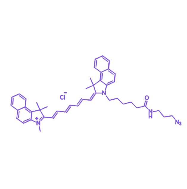 Cy7.5-N3(别名Cyanine7.5 azide或Cy7.5-叠氮)是生物化学与分子生物学领域的关键工具,其核心价值在于结合Cy7.5荧光染料的优异光学特性与叠氮基团(-N3)的高反应活性,可广泛应用于生物分子标记、化合物递送系统研发及生物传感器构建等场景。 Cy7.5-N3的光学性能表现为在近红外区域(约750~770nm)具有强烈吸收,并于约790nm处发射荧光。这一特性使得近红外光能够有效穿透深层生物组织,显著减少背景荧光干扰与光散射现象,从而在成像应用中提升清晰度与检测深度,助力科研人员对生物体内微观结构与动态过程的精准观察。 该化合物的化学活性主要依赖于叠氮基团(-N3)的存在,其可通过高效、特异的点击化学反应与含炔基的分子实现共价连接。这一反应机制确保了Cy7.5-N3在生物分子标记过程中的高选择性与稳定性,为构建靶向递送系统、开发高灵敏度生物传感器提供了可靠的化学修饰手段。