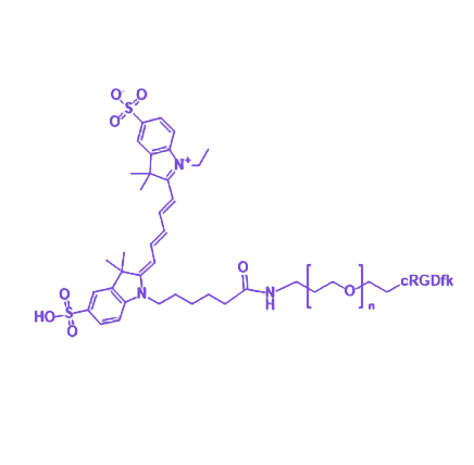 Cy5-PEG-cRGDfk是一种由Cy5近红外荧光染料、聚乙二醇(PEG)与cRGDfk环肽共价偶联形成的多功能靶向分子探针,兼具荧光成像功能、生物相容性修饰及主动靶向能力,适用于生物医学研究中的特异性成像与靶向递送应用。 Cy5荧光基团作为核心成像单元,具有646nm激发波长和662nm发射波长的近红外光谱特性,该波段可有效穿透生物组织并降低背景 autofluorescence干扰,确保在深层组织成像中保持稳定的信号输出。其光物理性质使其成为活体成像、细胞追踪及分子示踪的理想工具。 PEG连接臂通过增强分子亲水性提升探针的生物相容性,同时减少非特异性蛋白吸附和免疫原性反应,延长其在生物体内的循环半衰期,为靶向递送过程提供稳定的化学环境。 cRGDfk环肽片段作为靶向配体,可特异性识别并结合细胞表面的血管内皮生长因子受体(VEGFR),该受体在肿瘤血管内皮细胞等特定细胞类型中高表达,使探针能够通过受体介导的内吞作用实现对靶组织的精准定位,为肿瘤诊断、血管新生研究等领域提供高特异性的分子识别工具。