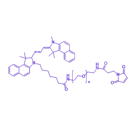 Cy3-PEG-Mal(Cy3-聚乙二醇-马来酰亚胺)是一种集成Cy3荧光染料、聚乙二醇(PEG)链和马来酰亚胺(Mal)基团特性的荧光标记试剂,在生物医学及科研领域中用于生物分子标记与检测。其设计通过多组分协同作用实现高灵敏度成像与特异性分子偶联,适用于复杂生物体系中的靶向分析。 Cy3荧光染料作为核心发光单元,可发射明亮红色荧光信号,确保标记对象在生物样本中具备高检测灵敏度,便于实时追踪目标分子或细胞的动态行为。聚乙二醇(PEG)链赋予试剂优异的水溶性,促进其在水溶液中均匀分散,提升与生物分子的反应效率;同时通过空间位阻效应减少非特异性结合,降低背景干扰,保障实验数据的准确性。马来酰亚胺(Mal)基团具有高度反应特异性,可与含巯基的生物分子(如半胱氨酸)快速形成稳定硫醚键,实现靶向分子的共价偶联,为构建功能化生物分子复合物或进行精准定位研究提供可靠化学工具。