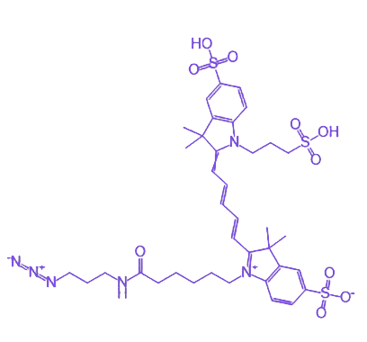 SulfoCy5-N3是一种兼具荧光标记功能与化学活性特性的复合化合物,其核心结构由磺化修饰的Cy5荧光基团与高反应活性的叠氮基团(-N₃)构成,适用于复杂生物体系中的特异性分子标记与成像分析。