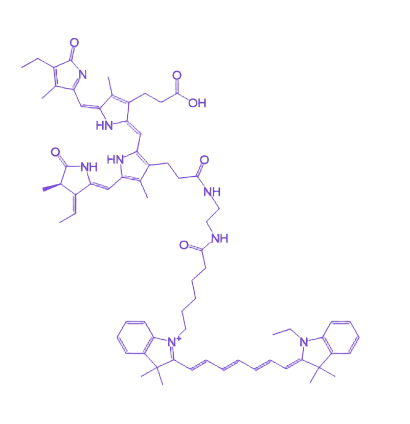 Cy7-PCB是通过化学方法将近红外荧光染料花菁7(Cy7)与天然色素藻蓝胆素(PCB)共价偶联形成的功能性共轭物,其设计旨在整合两种组分的核心优势,实现生物成像与靶向功能的协同增效。 该共轭物保留了Cy7的高荧光量子产率、良好光稳定性及长发射波长特性,可作为近红外荧光探针用于生物分子的特异性标记与动态示踪,适用于深层组织成像、荧光检测等生物医学研究场景。同时,通过引入PCB的天然生物活性基团,Cy7-PCB能够与特定生物靶点或酶系统发生相互作用,为靶向递送、活性调节等功能实现提供分子基础。 化学性质方面,Cy7-PCB的稳定性受偶联位点影响,在极端pH、高温或氧化环境下可能较单一组分更易发生降解,需在实验操作中控制反应条件以维持结构完整性。其分子结构中保留的活性官能团(如羧基、氨基)可通过酰胺化、点击化学等修饰方法与抗体、多肽、纳米载体等生物分子进一步偶联,拓展其在多模态成像、疾病诊断及药物递送系统中的应用潜力。