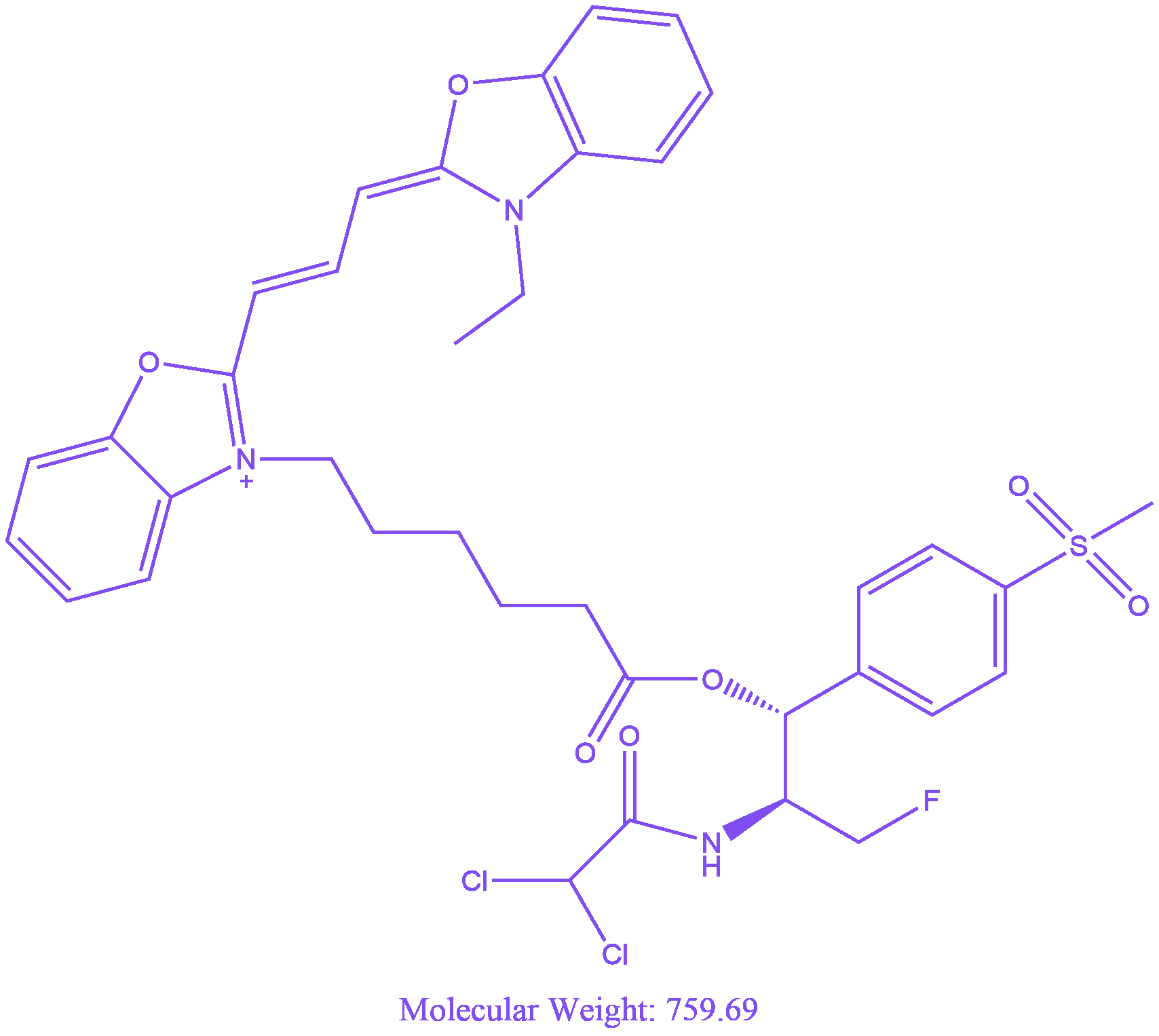 花菁染料CY2-氟苯尼考是一种整合荧光标记功能与抗生素活性的分子探针,其核心价值在于为细菌感染的精准可视化与治疗效果实时监测提供独特的化学工具。该分子通过花菁染料CY2的荧光特性实现生物成像,同时保留氟苯尼考的抑菌活性,解决了传统抗生素无法直接追踪体内分布与作用位点的技术瓶颈。 该试剂的关键物化性质与其结构设计密切相关。CY2基团赋予分子在480-500 nm范围内的强荧光发射(ε>10⁵ M⁻¹cm⁻¹),而氟苯尼考部分则确保其在生理pH条件下(7.2-7.4)的适度水溶性(约15 mg/mL)及对革兰氏阴性菌的特异性结合能力。分子中的酰胺键连接使两功能模块保持相对独立的构象,既避免荧光团对药物活性中心的空间位阻,又通过π-π堆积作用增强荧光量子产率(Φ≈0.35),这种构效关系是实现“诊断-治疗”一体化功能的分子基础。 在前沿科研应用中,该试剂主要用于细菌感染的活体成像与药效评估。其作用机制表现为:氟苯尼考部分通过竞争性结合细菌核糖体50S亚基抑制蛋白质合成,而CY2荧光团则在激光共聚焦显微镜或活体成像系统中提供实时定位信号。在小鼠肺炎克雷伯菌感染模型中,该探针可通过尾静脉注射后2-6小时内清晰显示肺部感染灶的动态变化,且荧光强度与细菌载量呈线性相关(R²>0.92),为评估新型抗生素的体内清除效率提供了量化研究手段。