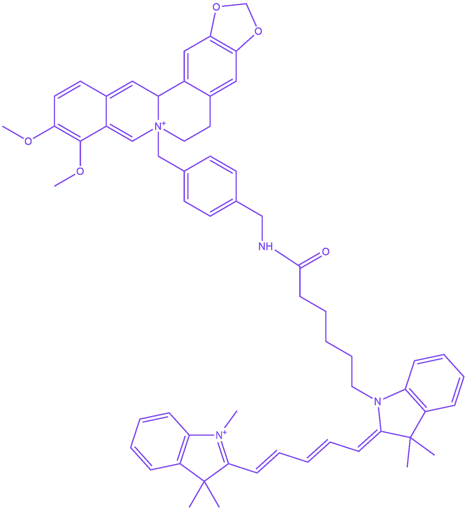 花菁染料CY5-小檗碱是通过共价偶联策略将近红外荧光团与生物碱活性分子整合形成的多功能探针,核心价值在于实现生物体系中特定靶点的可视化追踪与药理活性评估的同步进行。该分子保留小檗碱母体的生物靶向性与CY5染料的光学特性,为复杂生物环境下的动态过程研究提供独特化学工具。 该偶联物通常表现出良好的水溶性与生物相容性,其紫外-可见吸收光谱呈现CY5特征的646 nm主峰与小檗碱的345 nm次峰,荧光发射峰值约为662 nm,斯托克斯位移达16 nm,这种光谱特性使其在生物成像中具有较低的背景干扰。分子结构中,小檗碱的异喹啉环体系提供与生物大分子的特异性相互作用位点,而CY5的聚次甲基链赋予其近红外光穿透深度优势,二者通过柔性连接臂结合,既维持各自的功能构象,又避免光谱淬灭效应。 在前沿科研应用中,CY5-小檗碱主要作为靶向性荧光探针用于肿瘤细胞成像与药物递送研究。其作用机制基于小檗碱对肿瘤细胞表面特定受体的识别能力,通过受体介导的内吞作用进入细胞后,CY5荧光团在近红外激光激发下产生稳定信号,可通过共聚焦显微镜或活体成像系统实时监测药物在细胞内的分布与代谢过程。同时,该探针保留的小檗碱药理活性使其能够在成像过程中同步评估对细胞凋亡、炎症通路的调控效果,为从分子水平解析药物作用机制提供一体化研究方案。