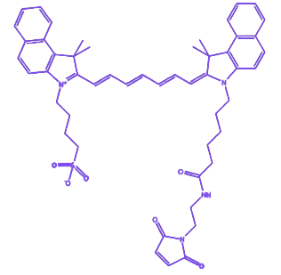 ICG-MAL(吲哚菁绿-马来酰亚胺)是一种创新性荧光探针,通过将吲哚菁绿(ICG)与马来酰亚胺(Maleimide)功能分子结合,既保留ICG的近红外荧光特性,又借助马来酰亚胺基团实现与生物分子的特异性稳定结合,为生物成像及相关研究提供高效工具。