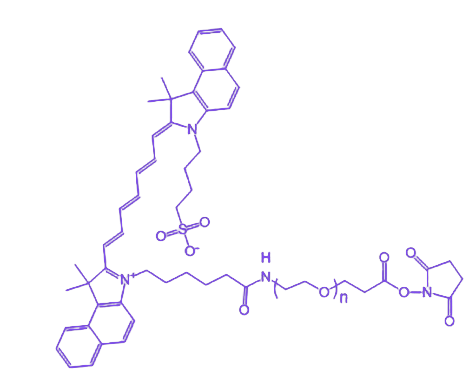 ICG-PEG-NHS是一种通过化学合成将吲哚菁绿(ICG)、聚乙二醇(PEG)与N-羟基琥珀酰亚胺酯(NHS)共价连接形成的多功能生物活性分子,集成了近红外荧光成像、生物相容性优化及生物分子偶联等核心特性,在生物医学领域具有重要应用潜力。 吲哚菁绿作为核心荧光组件,具备近红外光谱特性,可在785nm左右实现光吸收,820nm左右产生荧光发射,能够穿透生物组织深层,适用于体内深层组织的高灵敏度荧光成像。聚乙二醇片段的引入显著提升了分子的生物相容性与水溶性,有效延长其在体内循环的半衰期,同时降低免疫原性,并增强吲哚菁绿的化学稳定性。N-羟基琥珀酰亚胺酯作为活性功能基团,可在温和反应条件下与生物分子(如蛋白质、多肽、抗体等)中的氨基(-NH₂)发生特异性酰化反应,形成稳定的酰胺键,实现高效偶联。 该分子通过结构设计实现了功能协同:NHS活性酯基团赋予其便捷的生物分子修饰能力,可将荧光标记功能赋予目标生物分子,或用于构建靶向药物递送系统,在肿瘤成像、药物靶向输送及生物分子示踪等研究中展现出广阔应用前景。
