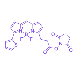 BDP 558/568-NHS(N-羟基琥珀酰亚胺酯)是一种氨基特异性荧光偶联试剂,以紫红色固体粉末形式存在,具有高反应活性与低干扰荧光特性,适用于生物分子标记及长时间动态成像研究。其核心优势包括NHS酯基团的高效特异性反应、近橙红色荧光的优异光学性能,以及对敏感细胞的良好兼容性。 基本理化性质:分子量约为549.31 g/mol,纯度≥95%,呈紫红色固体粉末状。荧光激发/发射波长分别为558 nm和568 nm,荧光量子产率达0.89,摩尔消光系数为8.4×10⁴ M⁻¹cm⁻¹,亮度显著高于传统罗丹明类NHS酯染料,且光稳定性良好,可满足长时间动态成像需求。 反应特性:NHS酯基团在弱碱性条件(pH 7.5-8.5)下能与氨基快速高效反应,具有高度特异性,不与羟基、巯基等其他基团发生非特异性结合,确保标记产物的高纯度与低背景干扰。 溶解性与使用兼容性:需依赖无水有机溶剂溶解,建议制备DMSO储备液后直接稀释至含少量有机相的缓冲液中使用,可有效避免细胞毒性;对神经元、干细胞等敏感细胞类型表现出良好的生物兼容性。 储存条件:需密封避光,于-20℃干燥环境中储存。固体粉末状态下可稳定保存2年,溶液则需现配现用,以防止NHS酯基团水解失效。