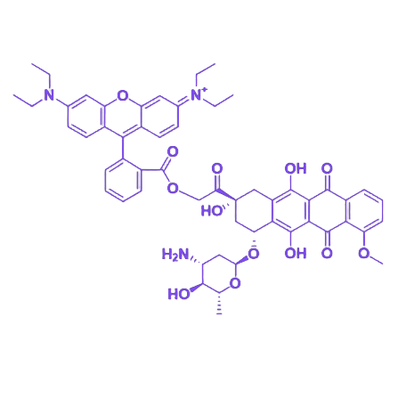 RB-DOX 是通过罗丹明 B 与多柔比星的特定化学反应紧密结合形成的稳定新化合物,兼具荧光特性与化合物活性,可在生物医学研究和疾病诊断中用于追踪多柔比星的体内分布及代谢过程。 该化合物的分子结构通过巧妙对接实现稳定结合,其中罗丹明 B 作为强荧光染料,其荧光发射峰典型处于 570nm 左右,此波段荧光在荧光显微镜下能呈现清晰明亮的信号,可精准定位 RB-DOX 在细胞或组织样本中的位置。罗丹明 B 具备优良的光稳定性,长时间光照下荧光强度不会大幅衰减,有效保障实验观察的准确性。同时,其良好的生物相容性使 RB-DOX 能与生物组织和平共处,不引发强烈免疫反应,确保在血液循环、细胞摄取等过程中稳定存在,持续发挥荧光标记功效,为相关研究提供有力支持。