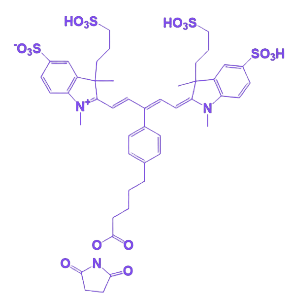 IR650-NHS是一款高性能近红外荧光标记试剂,通过优化的光学特性与生物相容性设计,实现生物分子的精准标记与深层组织成像。其核心优势在于结合了近红外光的组织穿透能力与NHS酯基团的高反应特异性,适用于蛋白质组学、免疫分析及分子影像等多领域研究。 该试剂的光学性能经过特殊优化,Max激发波长位于650纳米附近,发射光谱精准覆盖近红外光学窗口(670-720纳米)。此波段光子可有效穿透深层生物组织,显著降低hemoglobin、水分子等内源性物质的光吸收与散射干扰,同时因生物样本自身荧光背景极低,能够大幅提升检测信噪比,确保微弱特异性信号的清晰呈现。 在化学标记机制方面,IR650-NHS搭载高活性N-羟基琥珀酰亚胺酯(NHS ester)功能基团,可在弱碱性缓冲条件下(pH 7.0-9.0)与靶标分子中的伯氨基(-NH₂)发生高效酰化反应,形成稳定的共价酰胺键。这一特性使其能够对蛋白质N端、赖氨酸侧链、氨基修饰核酸及多肽等多种生物分子进行定点标记,且整个反应过程无需金属催化剂或苛刻反应条件,在室温或4°C生理相容环境中即可完成,最大限度保持被标记分子的天然构象与生物活性。 凭借近红外荧光探针的深层成像优势与NHS酯的生物分子靶向标记能力,IR650-NHS为蛋白质组学研究中的高通量分析、免疫检测中的信号放大,以及药物递送系统的体内追踪提供了可靠的技术支持,是生命科学领域进行高分辨率分子成像与精准生物分析的理想工具。