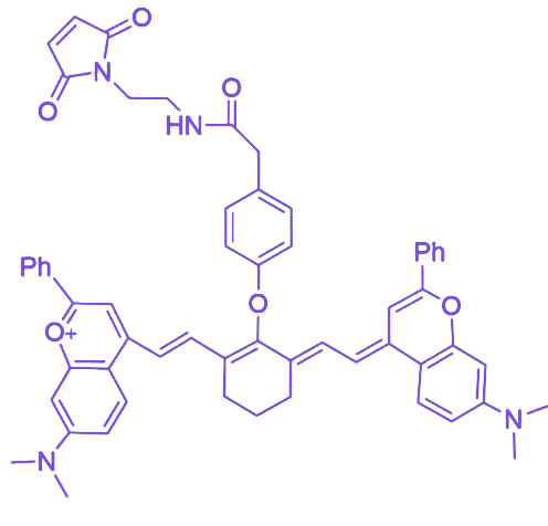 光学核心 Flav7 是专为 NIR-II 窗口设计的七甲川菁染料,通过黄酮杂环分子工程调控,荧光发射峰稳定处于 NIR-II 波段,此波长光在生物组织中散射弱、吸收少,穿透深度可达厘米级,能清晰呈现血管网络、肿瘤微环境等精细结构,分辨率远超传统近红外一区染料。引入的马来酰亚胺基团可在 pH 6.5-7.5 的温和条件下,与生物分子的游离巯基(-SH)发生特异性迈克尔加成反应,形成稳定硫醚键,且不与氨基、羟基等其他基团反应,实现准确标记。经验证,其标记后仍保持 Flav7 母体的强荧光信号与良好光稳定性,且生物相容性良好,毒性低。