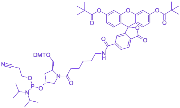 FAM phosphoramidite, 6-isomer (hydroxyprolinol)是一种通过在6-异构体荧光素(FAM)与亚磷酰胺活性基团间引入羟脯氨醇连接臂构建的功能化荧光试剂,其核心价值在于为高稳定性核酸探针制备提供关键材料支撑,尤其适用于活体成像探针、长周期检测探针等特殊需求场景。该试剂通过结构优化实现了荧光标记效率与探针生物活性的协同提升,是核酸分子标记领域的重要工具。