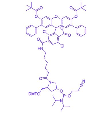 储存与使用方面,试剂需在 -20℃避光、无水、密封(充氮气) 条件下储存,保质期为 12 个月;使用时建议用无水乙腈配制成 0.1M 储备液,在核酸 5' 端延伸阶段加入,合成完成后经脱保护、HPLC 或 PAGE 纯化即可获得标记产物,操作流程符合常规固相合成规范。该试剂是制备高稳定性核酸探针(如活体成像探针、复杂样本检测探针)的关键材料。