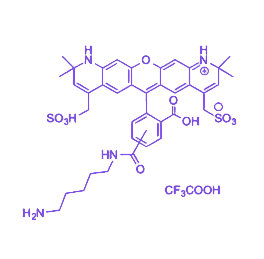 APDye568-Cadaverine 是一款高性能红光羧基靶向荧光探针,其核心优势在于尸胺基团(双伯胺结构)与羧基的高效特异性偶联,结合 APDye568 红光波段的低背景、高穿透特性,可精准满足羧基修饰生物分子(如酸性多糖、羧基化蛋白)的标记需求。 该探针吸收/发射波长分别为 578/605nm,消光系数达 138,000 cm⁻¹M⁻¹,荧光量子产率 0.69,亮度较传统 Cy3.5-Cadaverine 显著提升。其红光波段可有效避开生物样本自发荧光(400-550nm)与叶绿素荧光(680nm)干扰,信噪比明显高于橙光探针。 依托“EDC/NHS 活化-胺羧偶联”机制:先通过 1-乙基-(3-二甲基氨基丙基) 碳二亚胺(EDC)与 N-羟基琥珀酰亚胺(NHS)活化生物分子的羧基,生成高活性 NHS 酯中间体,再与尸胺的伯胺(-NH₂)形成稳定酰胺键。双胺结构可同时结合两个活化羧基,提升标记效率,且仅与活化羧基反应,不与氨基、巯基等其他基团交叉结合,特异性优于通用标记探针。 经分子修饰优化,探针水溶性极佳,可直接溶于纯水或生理缓冲液(无需有机助溶剂),避免 DMSO 对敏感生物分子(如酶、活细胞)的毒性影响,适配水相体系的所有羧基标记场景。 稳定性方面,探针在 pH 5.0-9.0 范围内荧光强度波动≤7%,室温下(25℃)水溶液可稳定保存 24 小时,-20℃ 冷冻保存 6 个月活性保留率达 90%;抗光漂白性突出,连续激发 2.5 小时荧光残留率~67%,适配长时间动态成像(如活细胞羧基动态追踪)。 实验兼容性良好,可与 FITC(绿色)、Cy5.5(近红外)等探针实现多色联用,满足糖组学(如透明质酸羧基标记)、蛋白组学(如胶原蛋白羧基化检测)、组织工程(如支架材料羧基修饰成像)等场景需求。 储存需避光-20℃密封干燥保存,建议分装为 100μg/管避免反复冻融(冻融次数≤3 次),常规提供 1mg、5mg、10mg 规格,适配科研与临床前研究中羧基靶向标记的多样化需求。