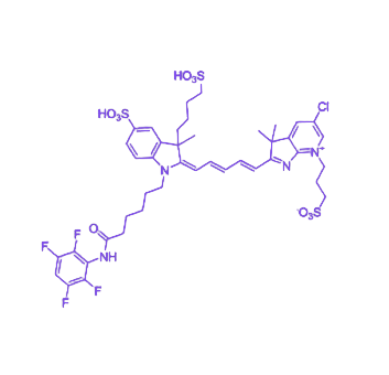 APDye680-TFP Ester是一款集高反应活性与近红外荧光特性于一体的科研级荧光标记试剂,以深蓝色固体粉末形态存在,核心优势在于 TFP 酯基团 的高反应活性与近红外荧光特性的结合,适用于标记抗体、酶、肽链等含氨基生物分子,尤其适合氨基密度低或对反应条件敏感的分子标记。 该试剂分子量约 834.90 g/mol,纯度≥95%,通过 TFP 酯基团 与生物分子的伯氨基发生特异性反应,相较于传统 NHS 酯,TFP 酯反应活性更高,在中性至弱酸性 pH(6.0-8.0)下即可反应,且不易水解。其荧光激发波长约 678 nm,发射波长 700 nm,处于生物组织自发荧光极低的 近红外区域,可穿透深层组织,信噪比明显优于可见光染料。 储存需密封避光,置于-20℃干燥环境;溶液状态需分装后-80℃冻存,避免反复冻融超过 3 次。实验时需注意:反应体系需排除含氨基缓冲液(如 Tris),防止竞争性抑制;标记后通过凝胶过滤或透析去除游离探针,确保实验准确性。其高活性、高特异性与光稳定性,使其成为生物医学研究中荧光标记的优质选择。