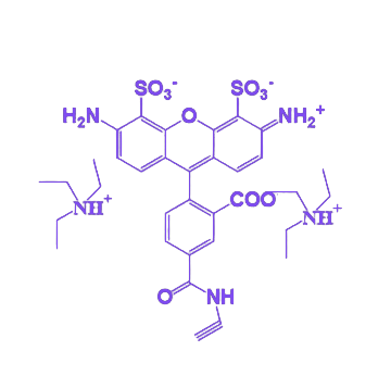 AF488-alkyne,5-isomer 是 Alexa Fluor 488 系列的 荧光探针,具备优异的光学性能与生物正交反应活性,适用于生物荧光标记与动态成像研究。其空间结构设计使其在 488nm 激光激发下发射峰值约 519nm 的明亮绿色荧光,结合高荧光量子产率与出色光稳定性,可实现高灵敏度、长时间的生物样本观察,准确捕捉生物过程的细微变化。5 位炔基赋予的 生物正交反应能力使其能通过铜催化(CuAAC)或无铜点击化学(如 SPAAC 与 DBCO 试剂)与叠氮基团特异性偶联,反应在生理条件下温和进行,不干扰生物分子天然结构与功能,为生物分子的定位、追踪及功能研究提供可靠技术手段。 该探针的核心优势体现在光学特性与反应活性的协同优化:高荧光量子产率确保光能向荧光信号的高效转化,提升检测灵敏度;优异光稳定性保障长时间成像或多次激发过程中的信号稳定性,有效抵抗光漂白;特异性生物正交反应则实现对叠氮修饰生物分子的精准标记,为活体细胞动态观察与分子互作研究提供高时空分辨的技术支持。其综合性能使其成为生物化学、细胞生物学及分子影像学研究中的理想工具。
