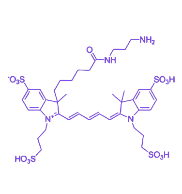 APDyeFluor647-NH2 是一种基于近红外染料 APDyeFluor647 的高灵敏度荧光标记试剂,分子末端修饰 伯胺(–NH2) 功能团,可通过特定化学反应实现与生物分子的共价结合,适用于生物成像与分析领域。该试剂具备近红外荧光特性、温和反应条件及广泛生物相容性,在活细胞成像、多重检测等场景中表现优异。 分子结构上,该试剂以 APDyeFluor647 为荧光母体,末端引入可反应的 伯胺基团,通过与 羧基(–COOH)、异硫氰酸酯(–N=C=S)等基团发生缩合反应(如 EDC/NHS 活化反应),实现对蛋白质、多肽、寡核苷酸等生物分子的共价标记。反应过程在中性或微碱性缓冲液中即可完成,条件温和且对大分子结构无破坏性,确保标记后生物分子活性保持良好。 光学性能方面,该试剂的 较大激发波长约为 650 nm,较大发射波长约为 670 nm,处于近红外光区间。此波段具有 低自发荧光干扰 和 组织穿透力强 的特点,能够有效提高深层组织成像的信噪比,特别适用于活细胞动态观察及小动物模型的体内成像实验。其高亮度和良好的光稳定性,使其在实时成像、长时间追踪和高分辨率显微镜实验中表现突出,可与其他颜色荧光染料协同用于多重检测分析。 应用场景涵盖抗体标记、细胞膜蛋白示踪、核酸探针构建、多色成像、免疫分析及生物传感器开发等领域。实验操作中,试剂溶解后应分装保存,避免反复冻融和强光直射;使用时需精确控制染料与生物分子的摩尔比,平衡标记效率与分子功能活性,以获得最佳荧光信号和实验效果。