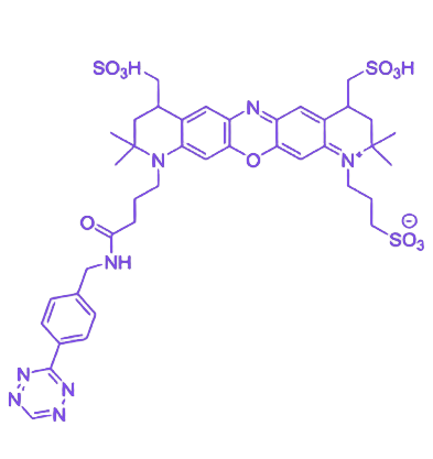 APDye660R-TZ是一种基于近红外荧光探针技术的生物正交标记试剂,其核心染料APDye660R具备高亮度、光稳定性与低背景噪声特性,通过引入Tetrazine(TZ)功能团实现与转烯烃(如TCO)分子的高效偶联。该探针利用Inverse-Electron-Demand Diels-Alder(IEDDA)反应机制,在无金属催化剂条件下完成快速、高选择性共价连接,显著降低生物体系背景干扰,适用于复杂环境下的精准标记。 光学性能参数表现为激发峰约645 nm、发射峰660 nm的近红外波段特征,可有效穿透生物组织并减少自发荧光干扰,特别适合深层组织成像应用。TZ基团的化学惰性设计确保其仅与TCO修饰分子发生特异性反应,避免对生物大分子的非靶向结合,从而提升成像信噪比与空间分辨率。 该试剂在活体分子成像、活细胞动态追踪、生物大分子修饰(如核酸/蛋白质标记)及纳米载体可视化等领域展现出独特优势。其快速反应动力学(秒级至分钟级反应速率)与近红外光学特性的组合,为肿瘤靶向成像、受体-配体相互作用研究提供了高时空分辨的技术支撑。反应体系兼容生理pH环境,无需苛刻反应条件,可直接用于活体细胞标记与在体实验,标记效率较传统方法提升1-2个数量级。 产品采用超纯级合成工艺,通过HPLC-MS双重质控确保批次稳定性,荧光量子产率>0.35,摩尔消光系数>80,000 L·mol⁻¹·cm⁻¹,在4°C避光储存条件下可稳定保存12个月以上。其小分子探针特性可穿透细胞膜与血脑屏障,在神经科学研究与全身成像中具有不可替代的技术价值,为生命科学基础研究与临床前转化医学提供高性能工具。