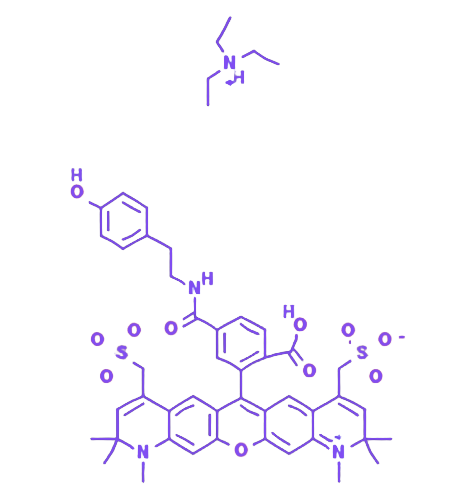 AF-594-tyramide是一种基于Alexa Fluor 594荧光团的酪胺衍生物,具备高亮度、低光漂白及良好光稳定性等核心优势,通过辣根过氧化物酶(HRP)催化的特异性反应实现信号放大标记,适用于荧光显微镜、共聚焦成像及多重免疫组化实验,尤其在低丰度靶标的可视化研究中展现出更高的信噪比和检测灵敏度。 其核心作用机制在于酪胺基团在HRP与过氧化氢共同作用下被氧化为反应性中间体,该中间体可与组织切片或细胞膜蛋白上的酚羟基或酪氨酸残基发生快速共价结合。此反应具有高度特异性和非扩散性,确保荧光信号严格局限于酶活性区域,显著提升检测的空间分辨率。 该产品的光学性能表现突出,发射波长为594 nm,发光强度高且背景噪声低,光漂白耐受性强,能够在长时间成像或高激发功率条件下保持稳定的信号输出。在应用领域方面,广泛覆盖免疫组化(IHC)、原位杂交(ISH)、信号放大成像及分子定位等实验场景。用户可获取不同规格和纯度的产品,以满足多样化的实验需求。