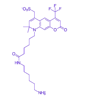 AF430-NH2 是 Alexa Fluor 系列荧光染料中的高性能成员,其核心结构修饰有高反应活性的氨基官能团(-NH2),具备优异的荧光性能与灵活的生物分子偶联能力,广泛适用于荧光成像及生物分子标记领域。 AF430-NH2 在荧光光谱特性上表现突出,其 Max 激发波长约为 430 纳米,激发后发射明亮锐利的黄绿色荧光,发射峰位于 540 纳米左右。该染料拥有高达 0.8 的 荧光量子产率,能将大部分吸收的光能高效转化为荧光信号,确保标记物具备高荧光亮度;同时具备优异的 光稳定性,在高强度激光长时间照射下荧光信号不易衰减或淬灭,适用于活细胞实时动态追踪、高分辨率共聚焦显微镜成像等需长时间动态观察或多次扫描的实验,提供持续稳定的可靠荧光信号源。 其核心价值在于末端的氨基官能团,为与各类生物分子的共价连接提供了便利的化学反应接口。在常用缩合剂如 1-乙基-3-(3-二甲基氨基丙基)碳二亚胺盐酸盐(EDC)和 N-羟基琥珀酰亚胺(NHS)的活化作用下,氨基可与靶标生物分子上的羧基(-COOH)发生酰胺化反应,形成稳定酰胺键;此外,氨基还能与醛基、活性酯等其他活性基团反应。这种灵活的偶联化学特性,使其可广泛应用于标记蛋白质、多肽、抗体、核酸及糖类化合物等多种生物分子。