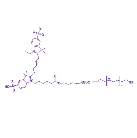 CY5-RGDC-PEG-N3 是一种集成荧光成像、靶向识别、生物相容性优化及高效偶联功能的多功能生物共轭物,其模块化结构设计使其在生物医学研究中具备多维度应用潜力。 CY5作为近红外荧光组件,具有约 649nm 激发波长与 670nm 发射波长特性,凭借高荧光强度和优异光稳定性,可有效降低生物成像中的自发荧光干扰,同时增强组织穿透能力,适用于深层生物样本的荧光示踪。RGDC多肽序列(精氨酸-甘氨酸-天冬氨酸-半胱氨酸)通过特异性结合细胞表面整合素受体,赋予分子靶向特定细胞的生物识别能力,提升对病变组织或特定细胞群体的选择性作用。PEG(聚乙二醇)链段的引入显著改善分子水溶性,延长体内循环时间,并减少非特异性蛋白质吸附,从而优化生物相容性与药代动力学性能。末端修饰的叠氮基团(-N3)可通过铜催化或无铜点击化学反应,与含炔基的生物分子、载体材料或纳米颗粒高效偶联,实现对目标物的精准标记、功能化修饰或靶向递送系统构建。